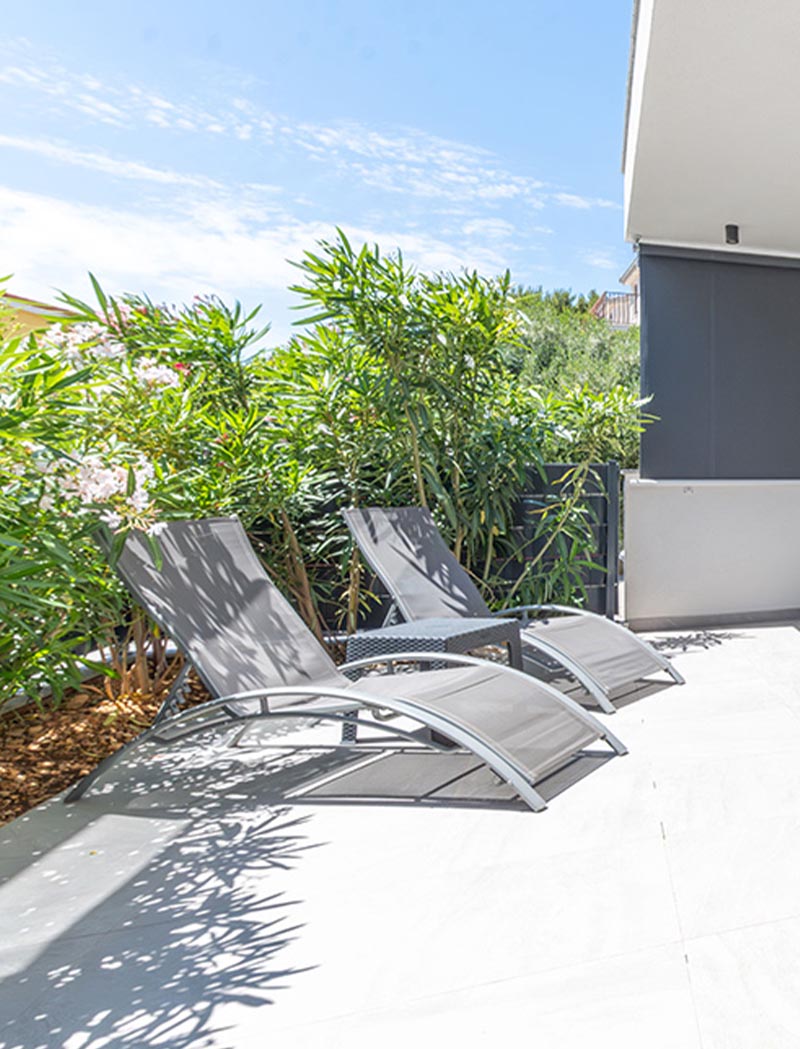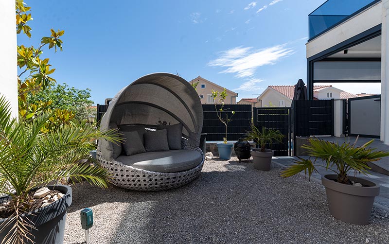 Ein besonderes Highlight ist die private 100qm Gartenterrasse, die zum Entspannen, Sonnen oder gemeinsamen Mahlzeiten im Freien einlädt. Dank durchdachtem Design verbindet das Apartment Funktionalität mit Wohlfühlatmosphäre. Zentrale Lage, hochwertige Ausstattung und großzügige Raumaufteilung machen das Apartment Ante ideal für erholsame, unvergessliche Ferien an der kroatischen Adria.